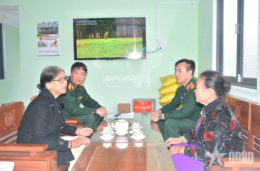 Cán bộ cơ quan Binh chủng Đặc công, Lữ đoàn Đặc công bộ 198 thăm hỏi, động viên bà Nguyễn Thị Tám, 76 tuổi, thôn Phú Phong, xã Hòa Thịnh, tỉnh Đắk Lắk (bên trái) trong ngôi nhà mới.