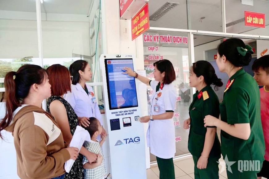 Cán bộ, hội viên phụ nữ Bệnh viện Quân dân y 16 hướng dẫn người dân sử dụng hệ thống tiếp đón tự động, góp phần nâng cao chất lượng phục vụ người bệnh.