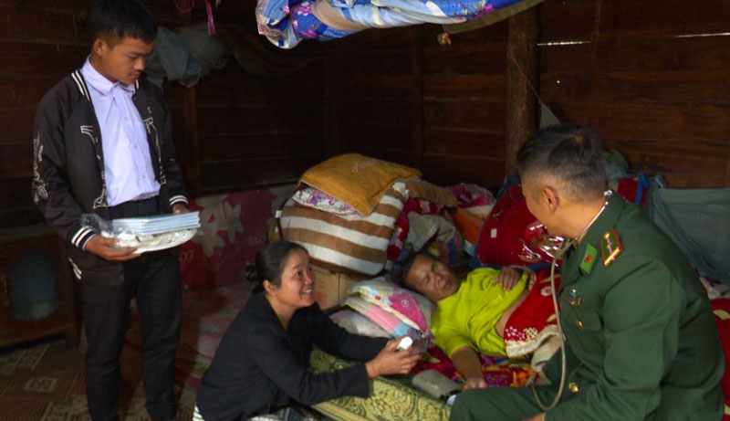 Nhân viên Trạm xá Quân dân y kết hợp bản Thoọng Pẹ đến tận nhà thăm khám cho những bệnh nhân gặp khó khăn trong việc đi lại.