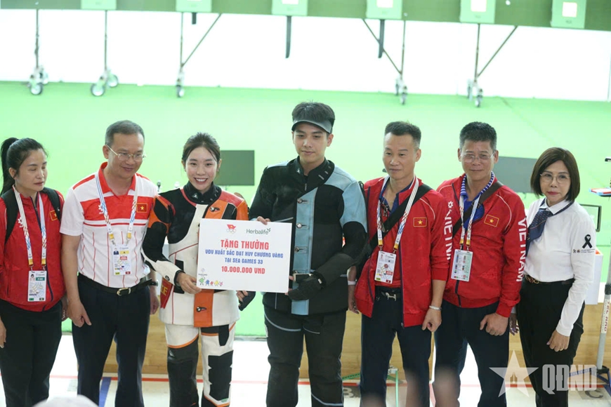 Biểu dương thành tích kịp thời, Chủ tịch Liên đoàn Bắn súng Việt Nam Đỗ Văn Bình trao thưởng 10 triệu đồng tặng huy chương vàng cá nhân và 15 triệu đồng tặng huy chương vàng đồng đội môn bắn súng tại SEA Games 33.