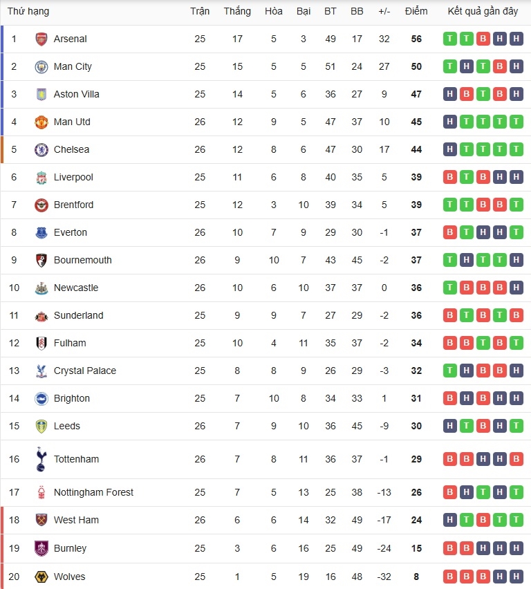| Bảng xếp hạng Ngoại hạng Anh 2025-2026. Ảnh: vnexpress |