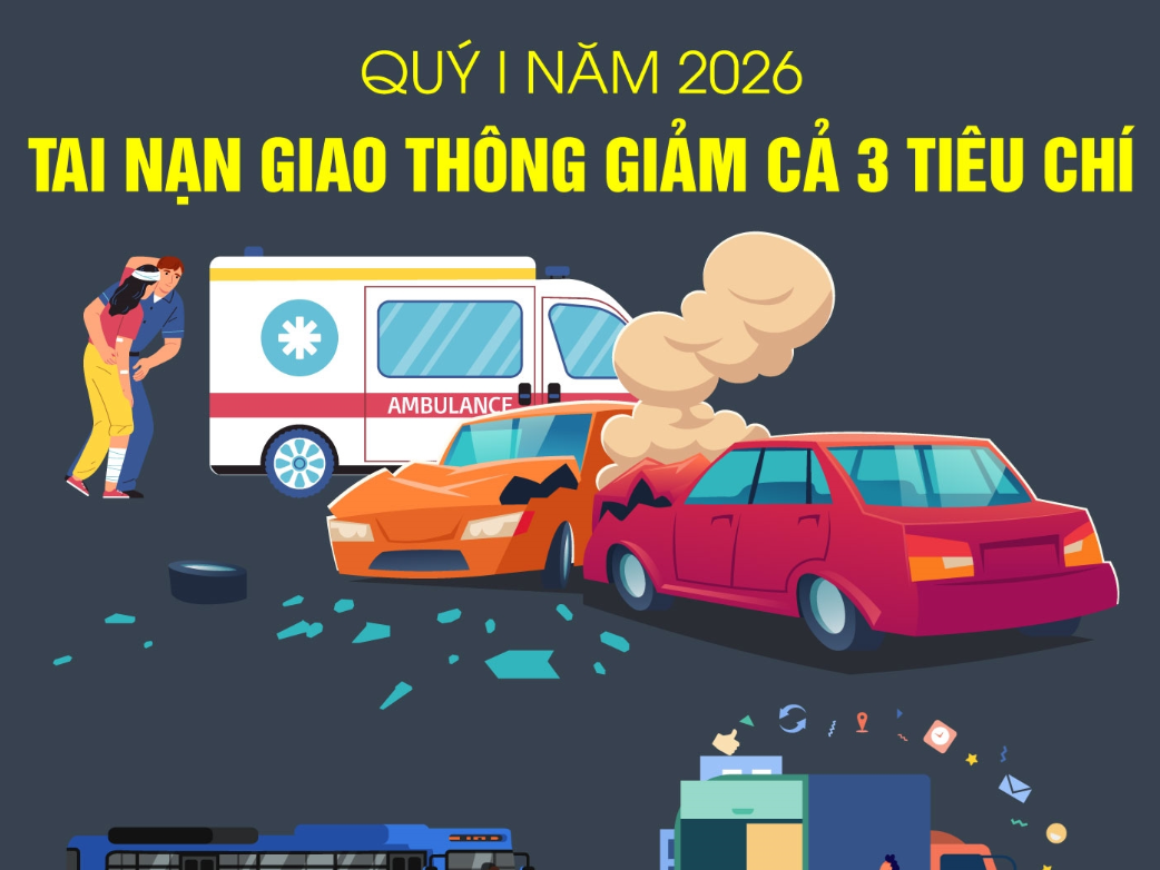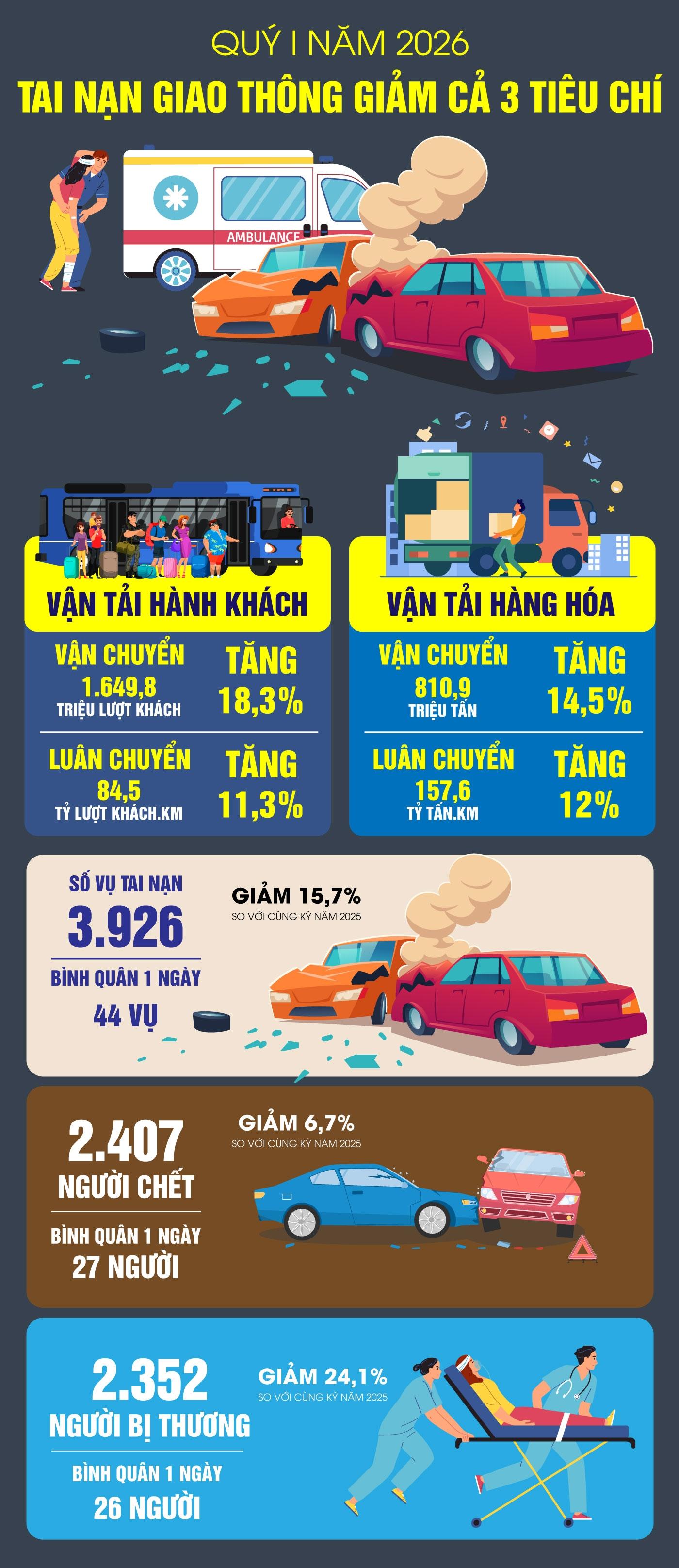 Quý I năm 2026, cả nước xảy ra 3.926 vụ tai nạn giao thông, làm 2.407 người chết và 2.352 người bị thương. So với cùng kỳ năm trước, số vụ tai nạn giao thông giảm 15,7%; số người chết giảm 6,7%, số người bị thương giảm 24,1%.