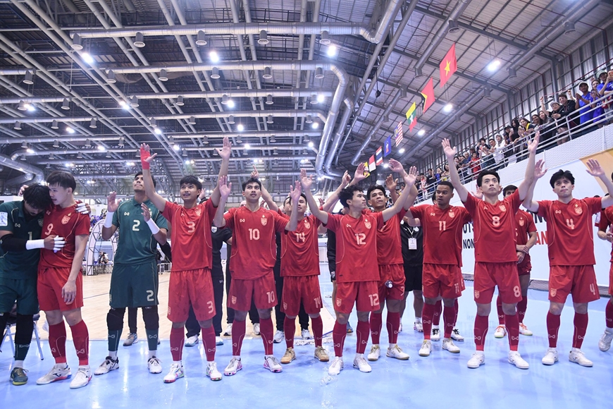 Các tuyển thủ futsal Thái Lan cảm ơn người hâm mộ sau khi giành chức vô địch Đông Nam Á. Ảnh: FA Thailand