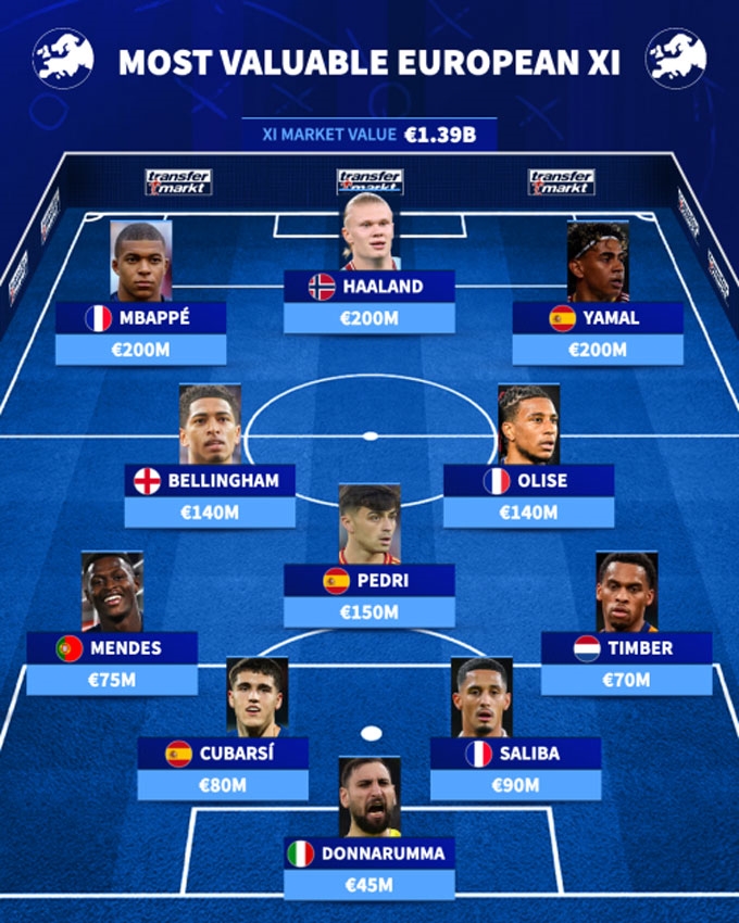 Transfermarkt công bố châu Âu sở hữu đội hình đắt giá nhất thế giới với tổng giá trị lên tới 1,39 tỷ euro. Đội hình này quy tụ nhiều ngôi sao hàng đầu thế giới như Gianluigi Donnarumma trong khung gỗ; hàng thủ có Nuno Mendes, Pau Cubarsi, William Saliba và Jurrien Timber.