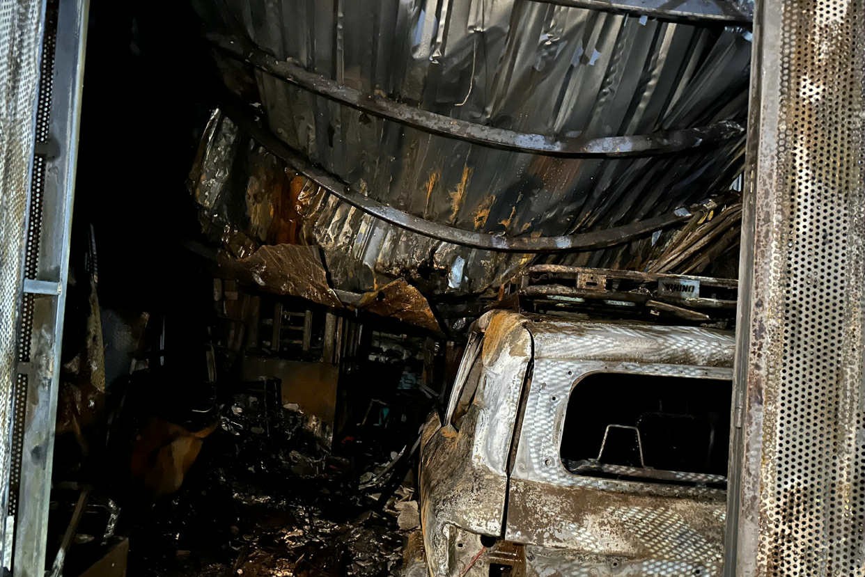 Lửa lớn khiến mái tôn sụp xuống. Ảnh: IT