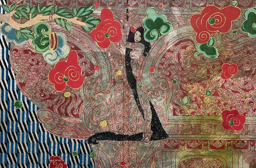 Điều đặc biệt trong những sáng tác gần đây của anh chính là ứng dụng kỹ thuật in bản rập hoa văn, họa tiết cổ truyền thống vào tranh. Không đơn thuần là sự hoài cổ, đây là cách anh khơi dậy ký ức văn hóa, đối thoại với lịch sử.