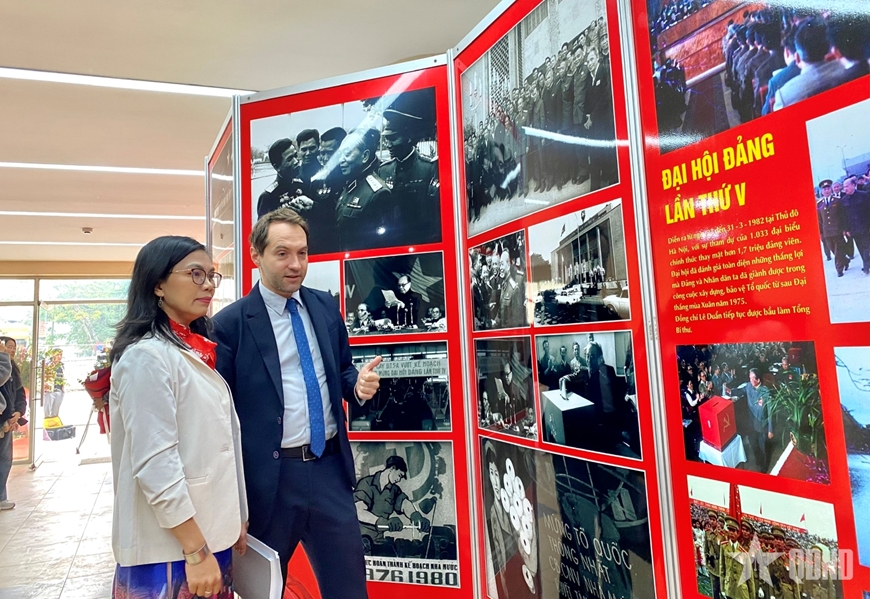Khách mời tham quan trưng bày giới thiệu các kỳ đại hội của Đảng. |