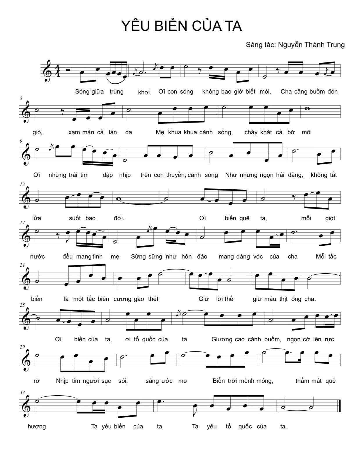 Ca khúc “Yêu biển của ta” được nhạc sĩ Nguyễn Thành Trung sáng tác bằng mỹ học trữ tình sử thi giàu xúc cảm. Tác phẩm mở ra bằng hình ảnh “Sóng không bao giờ biết mỏi” - biểu tượng cho sức sống bền bỉ và ý chí kiên cường của dân tộc. Trong mạch cảm xúc ấy, các hình ảnh cha mẹ, con thuyền, hải đăng được đan cài, dẫn dắt người nghe đến cao trào sử thi: “Mỗi tấc biển/ Là một tấc biên cương gào thét/ Giữ lời thề/ Giữ máu thịt ông cha…”
