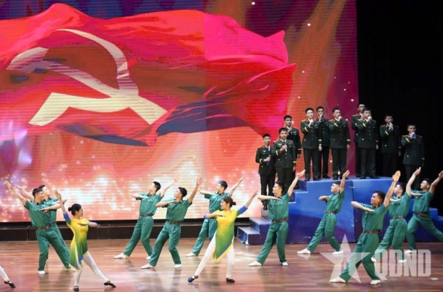 Tiết mục hát múa ca ngợi Đảng Cộng sản Việt Nam do các hạt nhân văn nghệ quần chúng Trường Sĩ quan Chính trị thể hiện. Ảnh: Tuấn Huy |