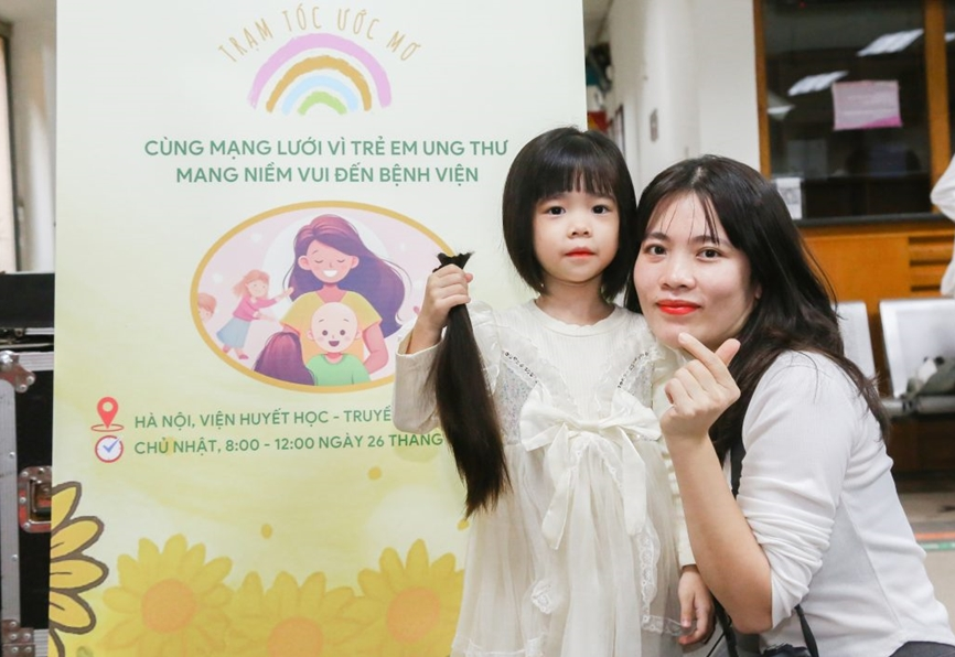 Mẹ con chị Phạm Thị Thuỳ Trang (Chương Mỹ) đến Viện Huyết học-Truyền máu Trung ương tham gia chương trình “Trạm tóc ước mơ”. Tại đây, chị Trang và con gái đã cắt đi mái tóc dài được chăm chút hơn một năm để dành tặng cho các em nhỏ và những người phụ nữ đã chiến đấu với căn bệnh ung thư.
