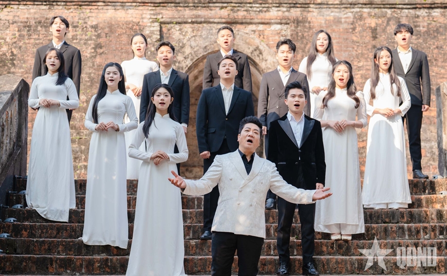 Hình ảnh NSND Quốc Hưng và các ca sĩ trẻ thể hiện trong MV.