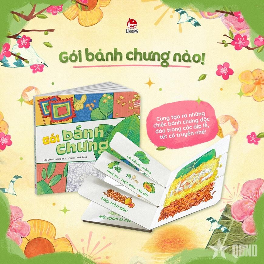Hai cuốn sách Tết tương tác “Gói bánh chưng nào!”, “Bày mứt Tết nào!” được thiết kế dành riêng cho các bạn nhỏ từ 2 tuổi, in trên chất liệu giấy carton cứng cáp, bo góc an toàn. Mỗi trang sách được chia thành ba phần có thể lật giở, cho phép bé tự do kết hợp các loại lá, gạo nếp, nhân bánh để tạo nên những chiếc bánh chưng độc đáo, hoặc sáng tạo ra những hộp mứt Tết phong phú hương vị ba miền. Bộ sách cũng mở ra cho trẻ một “kho” từ vựng thú vị về chủ đề món ăn ngày Tết: Các loại lá, gạo nếp, nhân bánh, hạt, mứt, ô mai...
