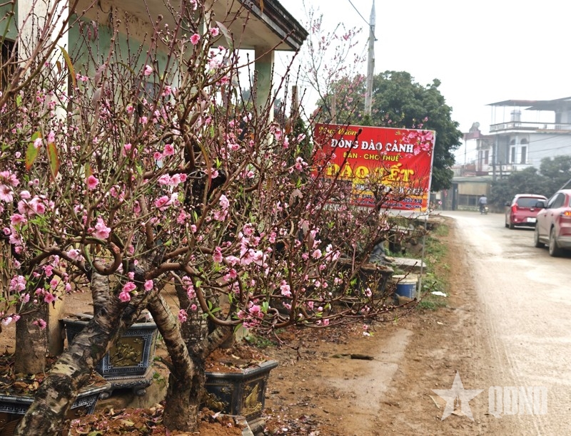| Chủ vườn trưng biển bán và cho thuê các gốc đào. |