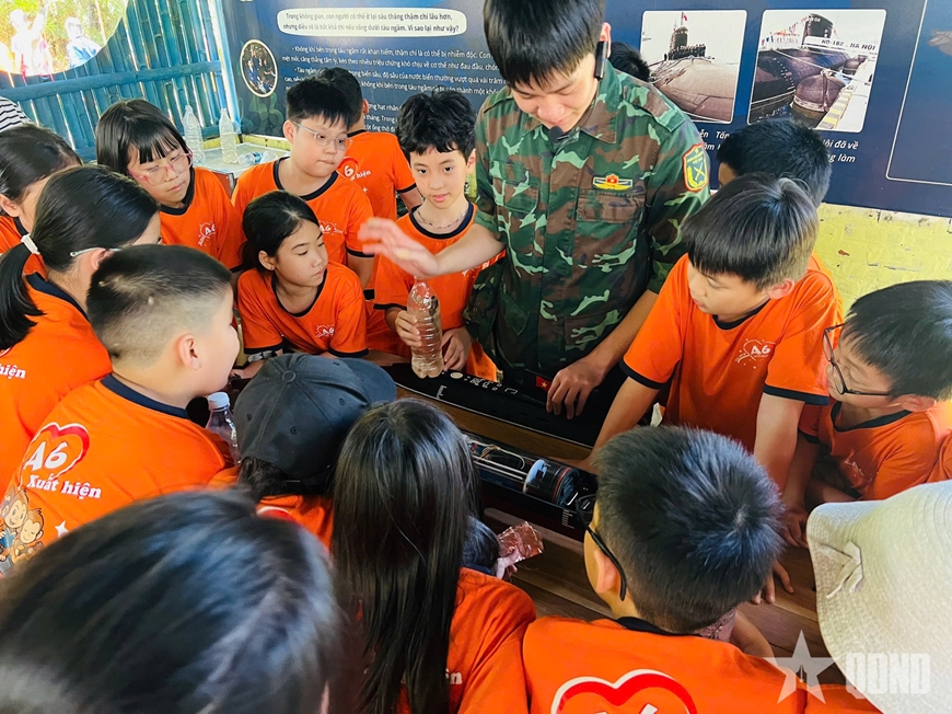 Các em háo hức nghe giới thiệu về tàu ngầm. |