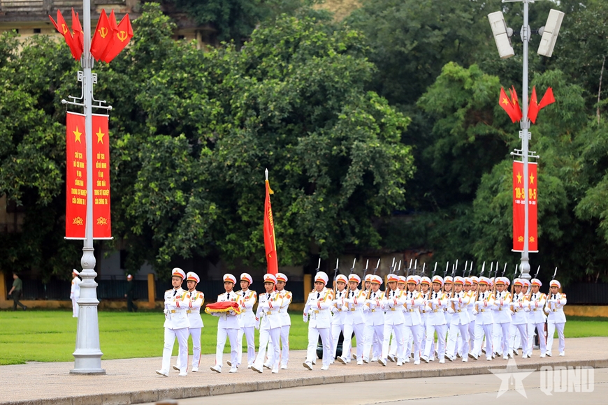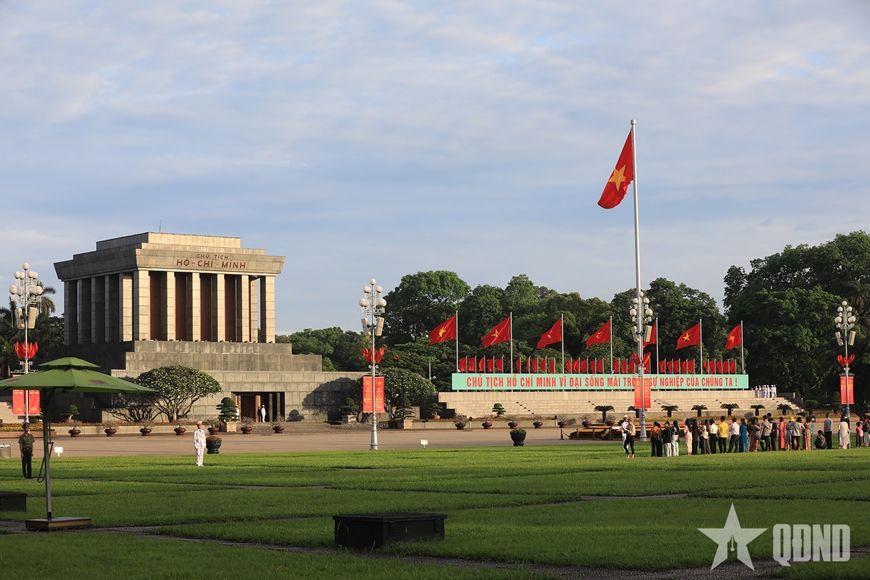 Ngày mới bắt đầu trên Quảng trường Ba Đình. Đúng 5 giờ 50 phút sáng, Đoàn thượng cờ trang nghiêm diễu binh theo đội hình từ bên phải Lăng Chủ tịch Hồ Chí Minh ra trước cột cờ trong tiếng quân nhạc hào hùng của hành khúc “Tiến bước dưới quân kỳ”.