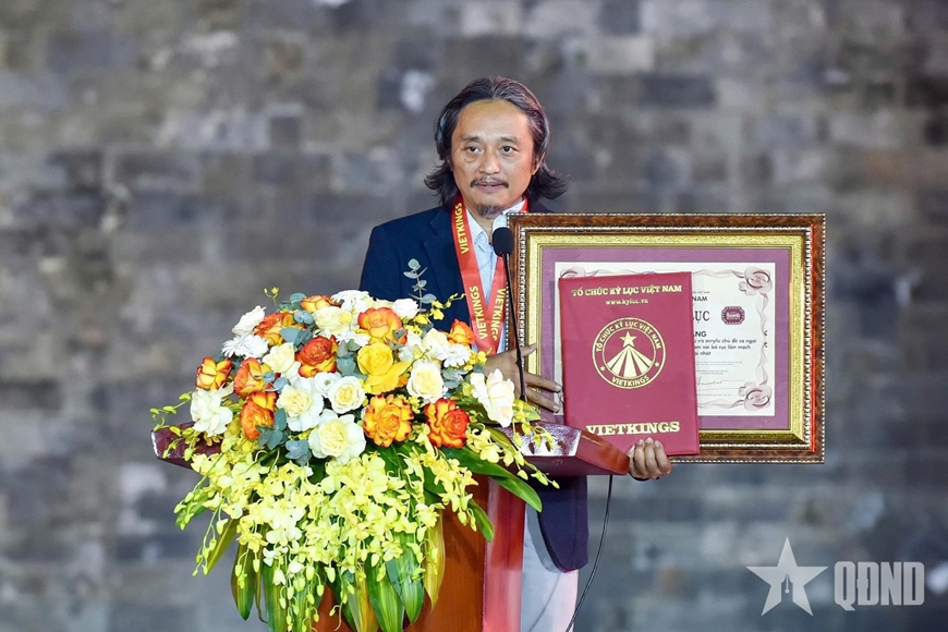 | Họa sĩ Ngô Bá Hoàng đón nhận bằng xác lập kỷ lục Việt Nam với tác phẩm “Chào Việt Nam - Quê hương tôi”. Ảnh: BẢO NGÂN |