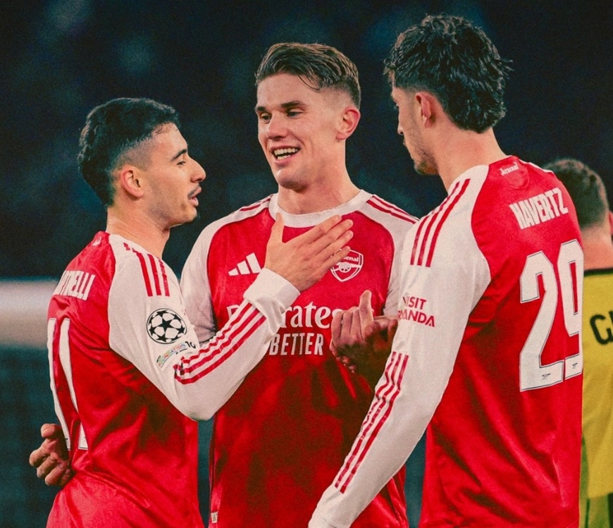 Các cầu thủ Arsenal mừng chiến thắng 3-2 trước Kairat Almaty, khép lại vòng phân hạng UEFA Champions League 2025-2026 với thành tích 8 trận toàn thắng. Ảnh: Arsenal FC |