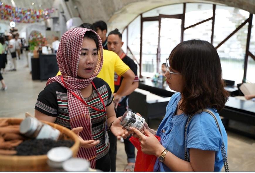 | Chị Võ Minh Mơ (quấn khăn) giới thiệu sản phẩm muối chấm thảo mộc B’rê. |