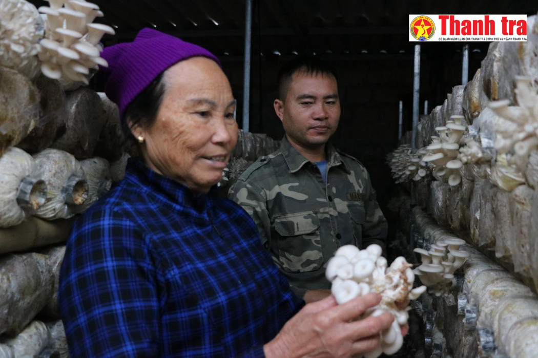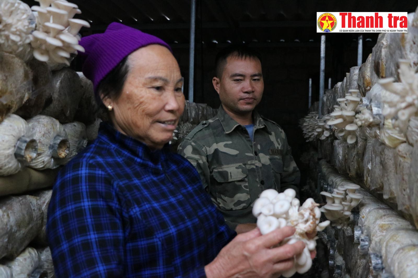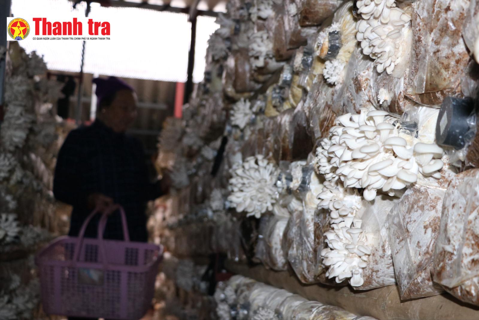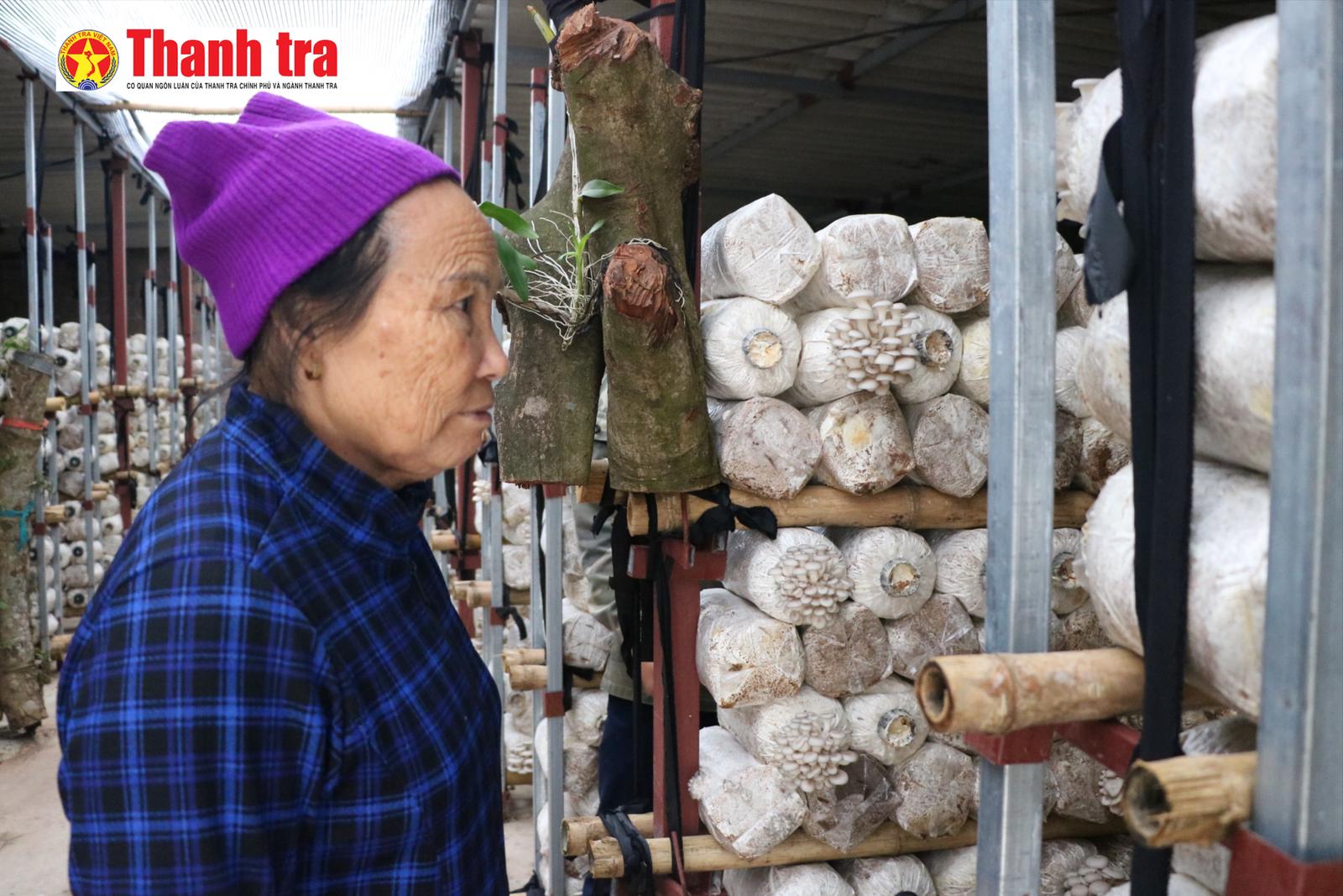 Mẹ anh Doanh cùng kiểm tra nấm trong nhà giàn. Hơn mười năm nay, gia đình anh gắn bó với nghề trồng nấm, coi đây không chỉ là công việc làm giàu bền vững, mà còn là cách gắn bó với quê hương. Ảnh: Đông Hà
