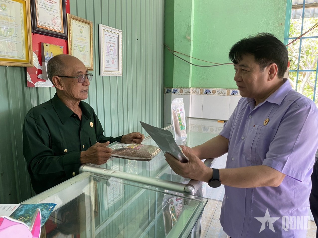 Cựu chiến binh Lê Văn Đấu (bên trái) giới thiệu sản phẩm với khách tham quan. |