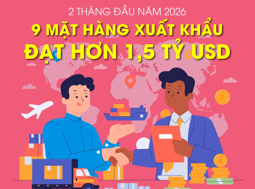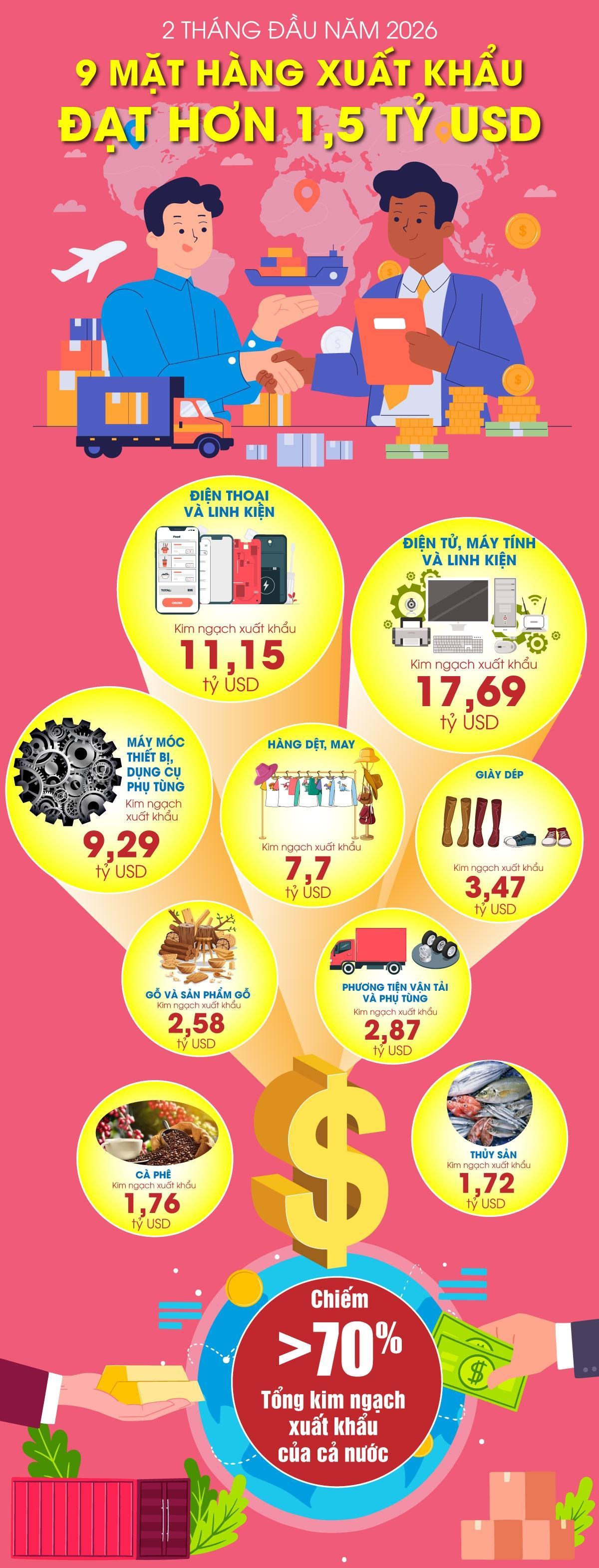2 tháng đầu năm 2026, có 9 mặt hàng xuất khẩu của Việt Nam đạt kim ngạch hơn 1,5 tỷ USD, chiếm hơn 70% tổng kim ngạch xuất khẩu của cả nước. Trong đó, mặt hàng điện tử, máy tính và linh kiện đứng đầu, với 17,69 tỷ USD kim ngạch xuất khẩu.
