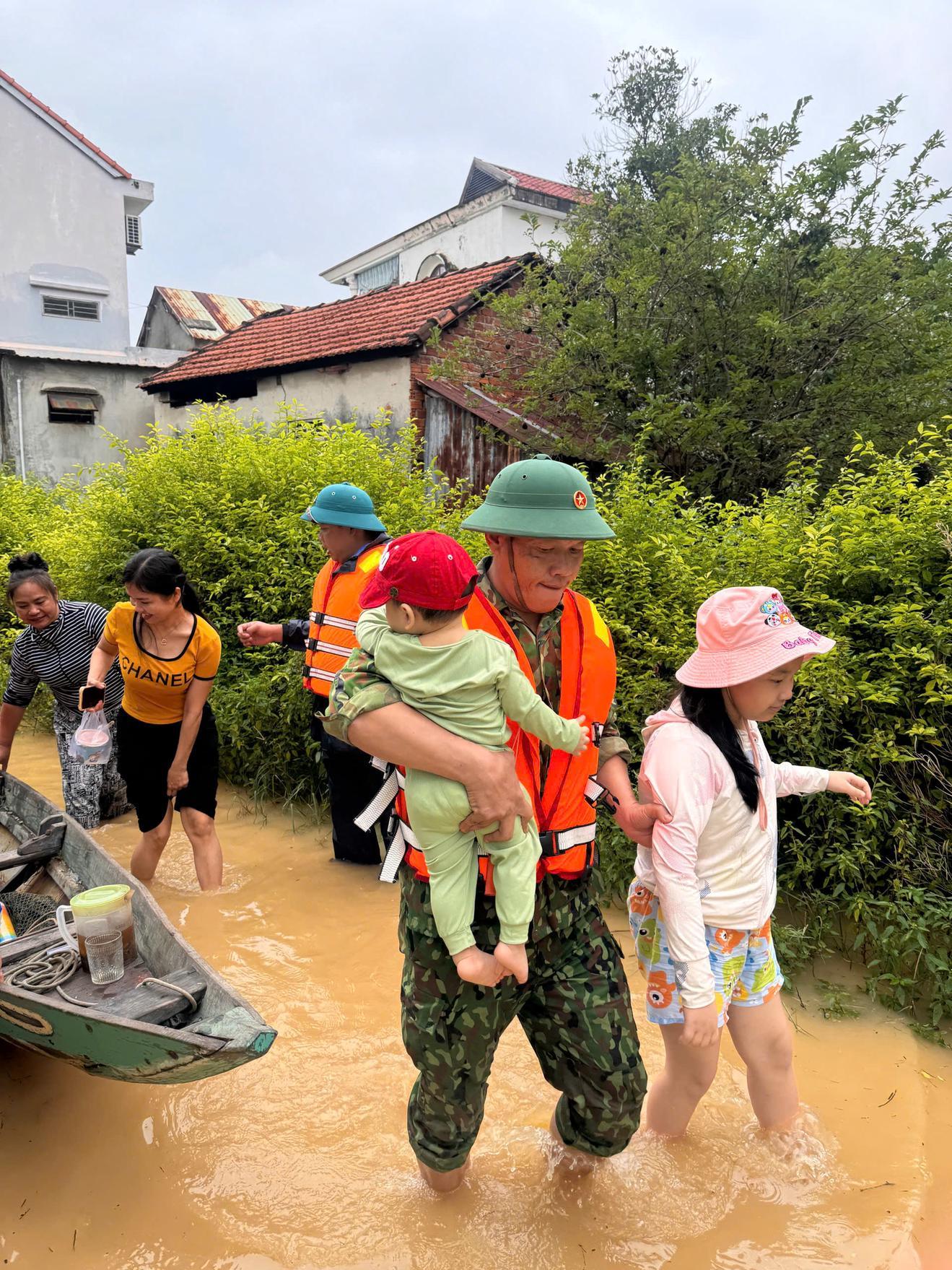 Cán bộ, chiến sĩ Quân khu 5 hỗ trợ đưa người dân khỏi vùng ngập lụt. Ảnh: Bảo Thắng
