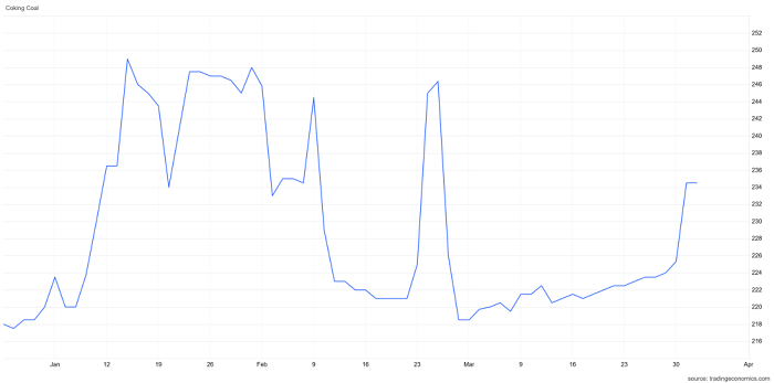 Đà tăng được củng cố bởi biến động giá năng lượng và nguồn cung bị siết chặt do chi phí logistics cao. Tại Trung Quốc, giá than cốc đã tăng liên tiếp trong ba tuần, đặc biệt mạnh trong tuần cuối cùng của tháng với việc các nhà máy chấp nhận đợt tăng giá đầu tiên từ ngày 1/4 khi sản lượng gang phục hồi.