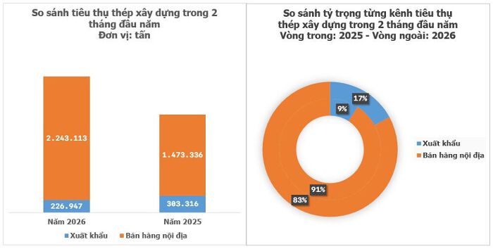 Theo tính toán từ số liệu của VSA, riêng thị trường nội địa đã tiêu thụ hơn 2,2 triệu tấn thép trong 2 tháng, tăng 52% so với cùng kỳ và chiếm tới gần 91% tỷ trọng.