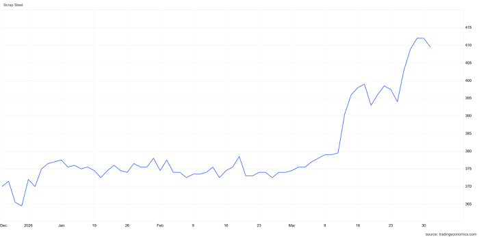 Giá than luyện coke hiện đang ở mức 234 USD/tấn, tăng gần 7% so với hồi đầu tháng 3. Quặng sắt tăng 8% cùng giai đoạn, hiện ở mức 107 USD/tấn và thép phế liệu tăng mạnh nhất với mức tăng 9%, ở mức 409 USD/tấn ghi nhận vào đầu tháng 4.