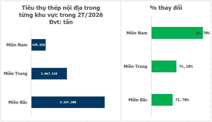 Xét theo khu vực, miền Bắc tiếp tục dẫn đầu về tiêu thụ thép cả nước khi bán hàng đạt hơn 1,33 triệu tấn, tăng mạnh 55%.