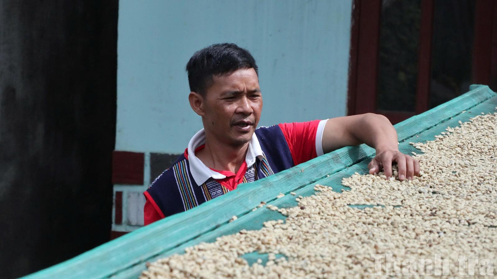 Anh Ha Hoang bên giàn phơi cà phê nhân Arabica của mình. Ảnh: Nhật Tiến