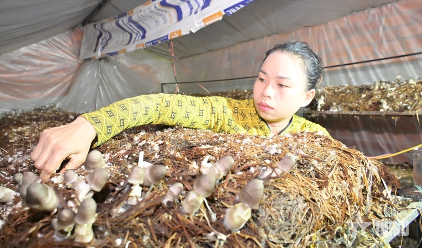 | Chị Lê Thị Hồ Linh kiểm tra sự phát triển của nấm rơm sạch. |