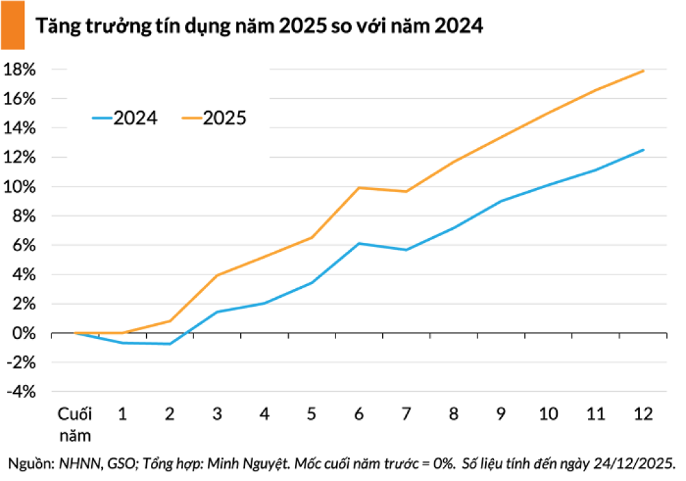Năm 2025, Ngân hàng Nhà nước (NHNN) định hướng tăng trưởng tín dụng ở mức khoảng 16%, tuy nhiên trên thực tế mức tăng trưởng tín dụng đạt được lại gần 18% nhằm hỗ trợ mục tiêu tăng trưởng GDP trên 8%.