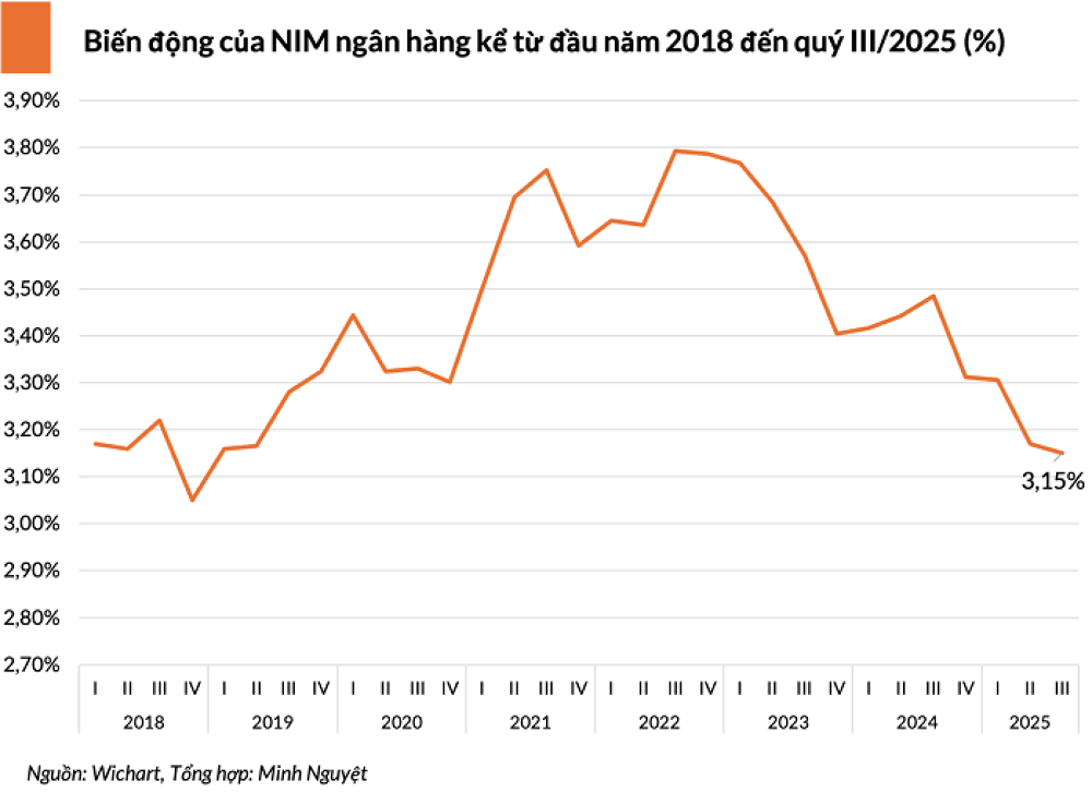 Ghi nhận dữ liệu từ WiChart, NIM của các ngân hàng niêm yết tiếp tục xu hướng thu hẹp trong quý III/2025 khi chi phí vốn tăng nhanh hơn lợi suất tài sản sinh lời; NIM ở mức 3,15%, giảm 0,02 điểm % so với quý trước đó, đánh dấu mức thấp nhất kể từ đầu năm 2019.