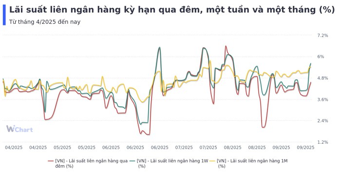 Trên thị trường liên ngân hàng, lãi suất qua đêm có xu hướng tăng nhẹ, bắt đầu từ mốc 3,79% vào đầu tuần và tăng dần qua các phiên, lên 4,57% tại phiên 25/9. Tổng cộng, trong tuần qua, lãi suất liên ngân hàng tăng 0,78 điểm %.