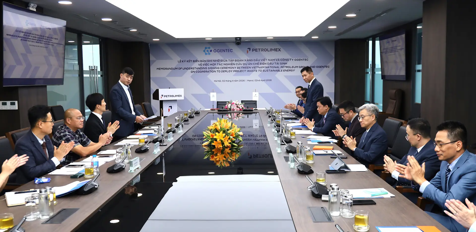 Trong bối cảnh tình hình địa chính trị thế giới diễn biến phức tạp, ảnh hưởng đến nguồn cung năng lượng toàn cầu đặt ra yêu cầu cấp thiết về việc đa dạng hóa nguồn cung và chuyển dịch năng lượng bền vững, ngày 02.04.2026, tại Trụ sở số 01 Khâm Thiên, Tập đoàn Xăng dầu Việt Nam (Petrolimex/Tập đoàn) và Công ty GGenTec đã ký kết Biên bản ghi nhớ hợp tác nghiên cứu dự án nhà máy sản xuất dầu tái sinh từ dầu thải, nhựa thải và cao su thải.