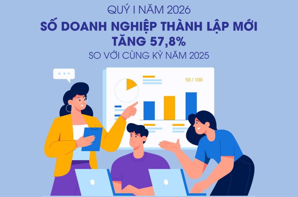 Quý I-2026, cả nước có hơn 57,4 nghìn doanh nghiệp đăng ký thành lập mới với tổng số vốn đăng ký gần 313,7 nghìn tỷ đồng và tổng số lao động đăng ký hơn 167,5 nghìn lao động, tăng 70,7% về số doanh nghiệp, tăng 36,1% về vốn đăng ký và tăng 19,1% về số lao động so với cùng kỳ năm trước.