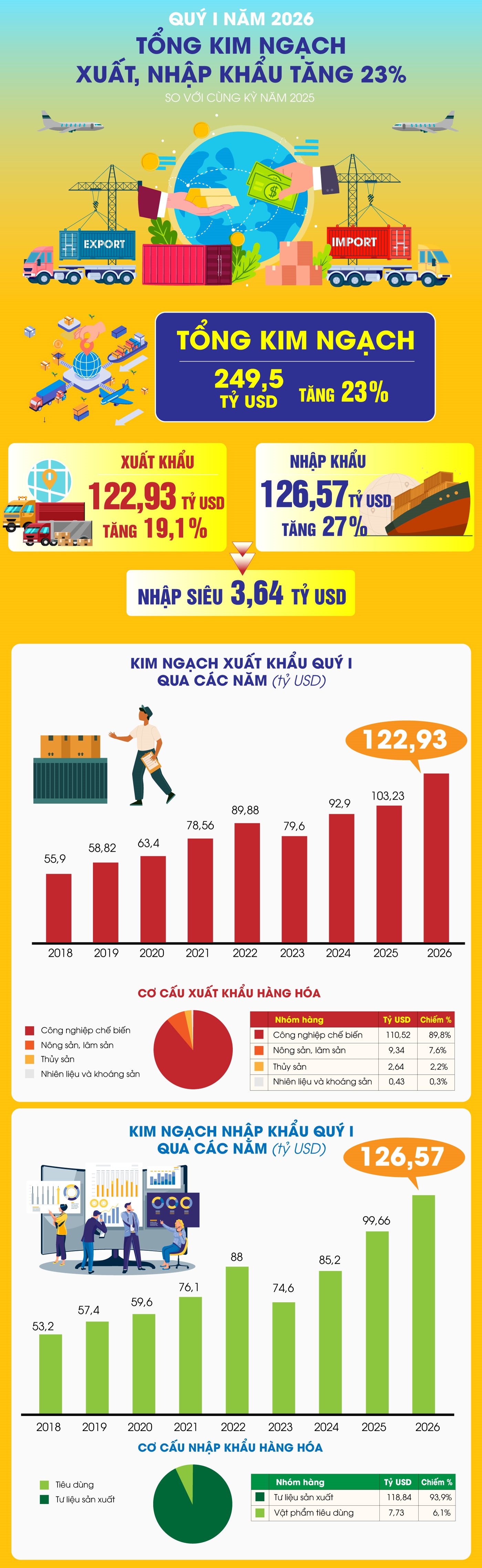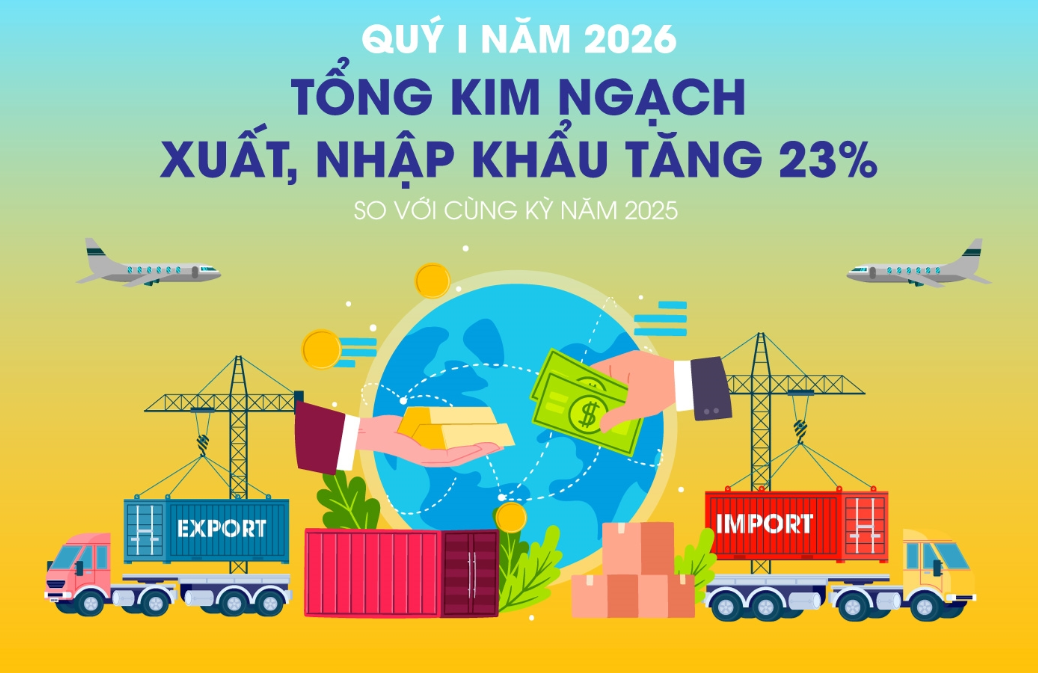 Quý I năm 2026, tổng kim ngạch xuất, nhập khẩu hàng hóa đạt 249,50 tỷ USD, tăng 23% so với cùng kỳ năm trước, trong đó xuất khẩu tăng 19,1%; nhập khẩu tăng 27,0%. Cán cân thương mại hàng hóa nhập siêu 3,64 tỷ USD.