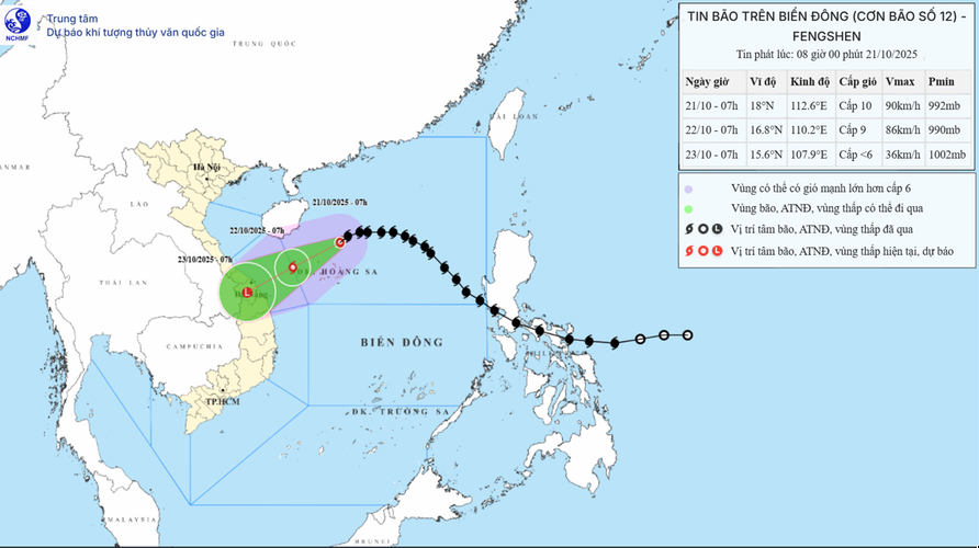 Theo Trung tâm dự báo Khí tượng thủy văn Quốc gia, hồi 7h ngày 21/10, tâm bão Fengshen ở khoảng 18,0 độ Vĩ Bắc – 112,6 độ Kinh Đông, cách Hoàng Sa khoảng 130km về phía Bắc.