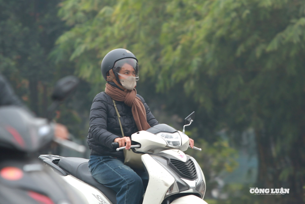 Trước tình trạng ô nhiễm không khí sáng nay, nhiều người dân đã chủ động đội mũ trùm kín đầu để chắn gió và bụi mịn khi điều khiển xe máy.