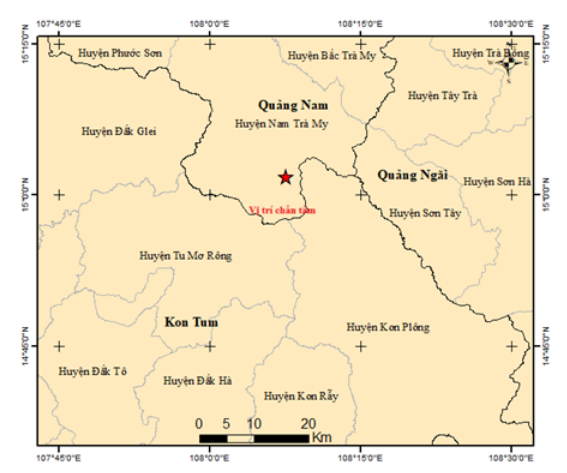 Cụ thể, vào lúc 0 giờ 9 phút ngày 26-5 (giờ địa phương), xảy ra trận động đất có độ lớn 2.6 tại huyện Nam Trà My. Tâm chấn có tọa độ 15,067 độ vĩ Bắc - 108,106 độ kinh Đông, độ sâu chấn tiêu khoảng 8,1 km.