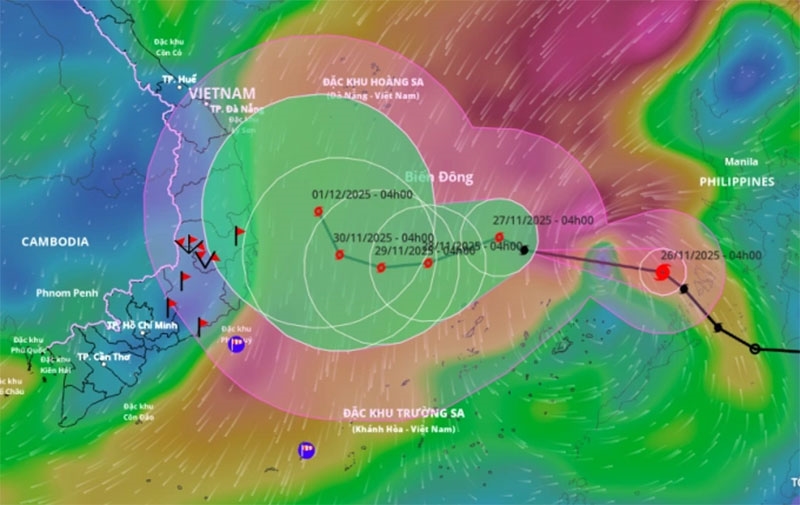 Dự báo hướng đi và vùng ảnh hưởng của bão Koto, sáng 26-11. Ảnh: Hệ thống giám sát thiên tai