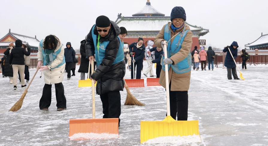 Các nhân viên dọn tuyết tại công viên Thiên Đàn sau một trận tuyết rơi ở Bắc Kinh, Trung Quốc. Ảnh: Tân Hoa xã