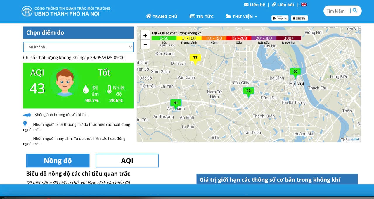 Sáng nay 29-5, chỉ số chất lượng không khí (AQI) ở Hà Nội chủ yếu ở mức tốt và trung bình. Chỉ số AQI dao động từ 41 đến 77.