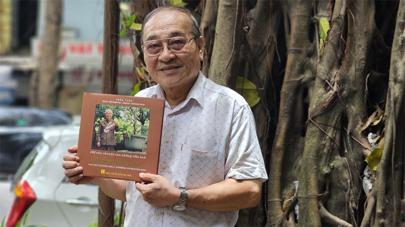 Nhà báo, NSNA Trần Tuấn và cuốn sách “103 câu chuyện sau những tấm ảnh Đại tướng Võ Nguyên Giáp”. Đây là cuốn sách thứ 5 của ông về vị tướng trong lòng nhân dân Việt Nam. Ảnh: Thanh Hà |