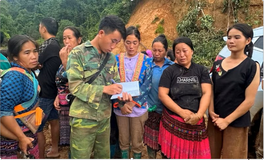| Trưởng bản Mùa A Thi thống kê thiệt hại của từng gia đình trong bản do ảnh hưởng lũ quét xảy ra rạng sáng 1-8-2025. Ảnh do nhân vật cung cấp |