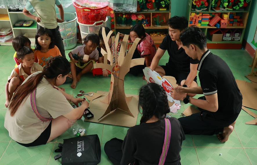 Các em nhỏ thích thú với mô hình dạy học kích thích sự sáng tạo. Ảnh: DOP