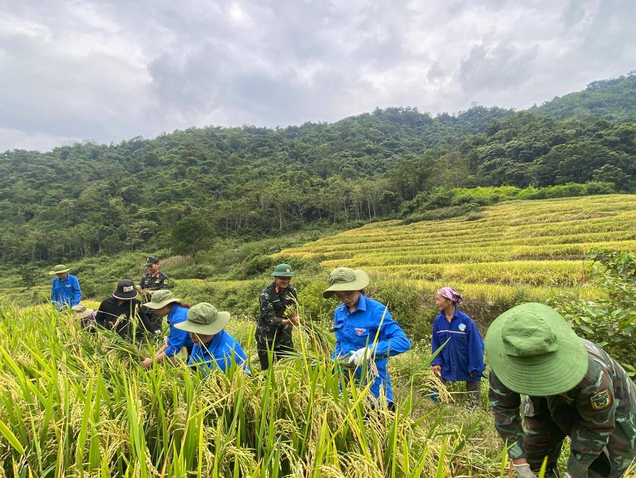 | Cán bộ, nhân viên, trí thức trẻ tình nguyện Đoàn Kinh tế - Quốc phòng 5 giúp dân gặt lúa. |