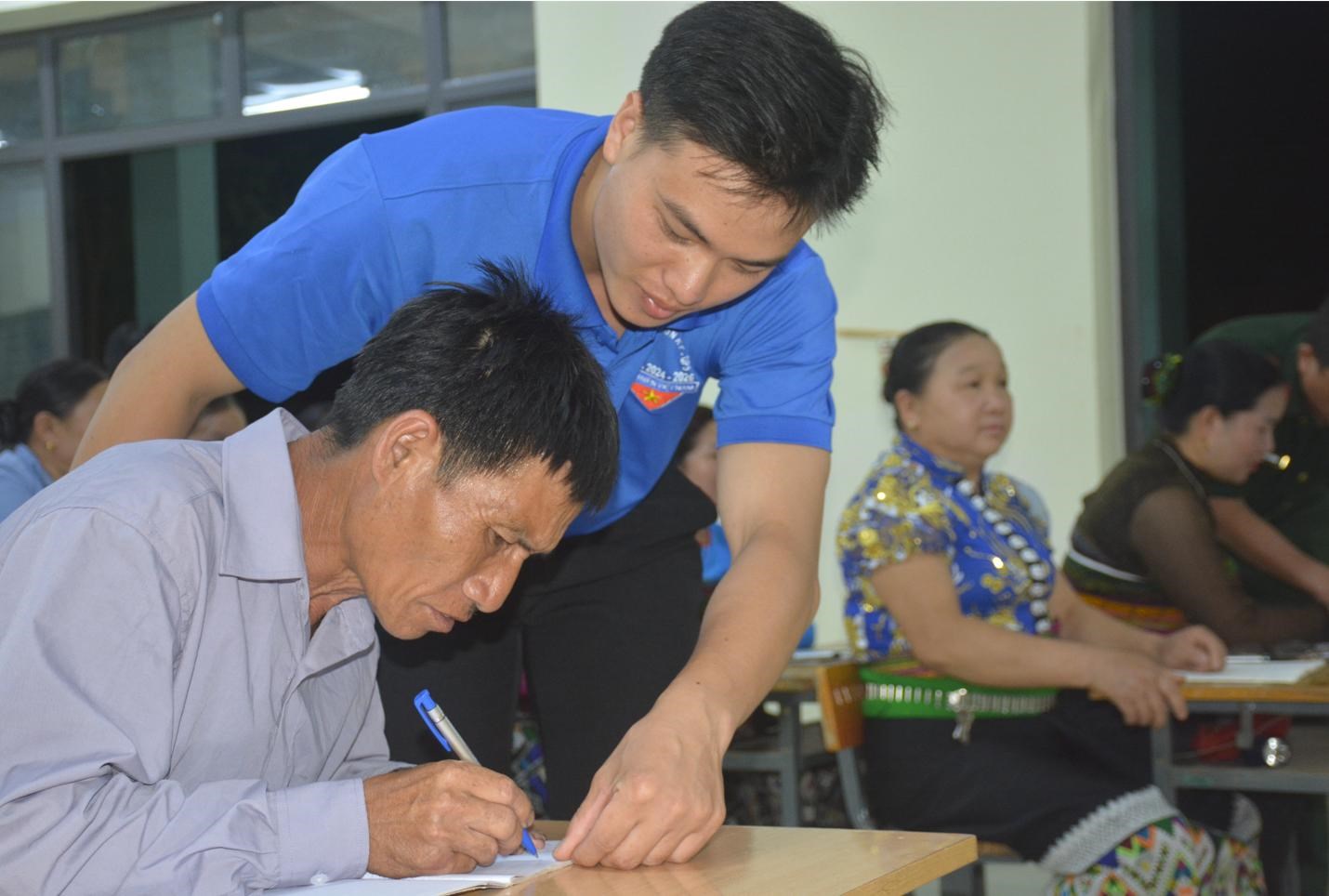 | Trí thức trẻ tình nguyện Đoàn Kinh tế - Quốc phòng 5 hướng dẫn bà con học tại lớp xóa mù chữ. |
