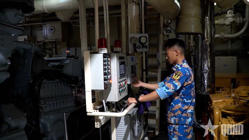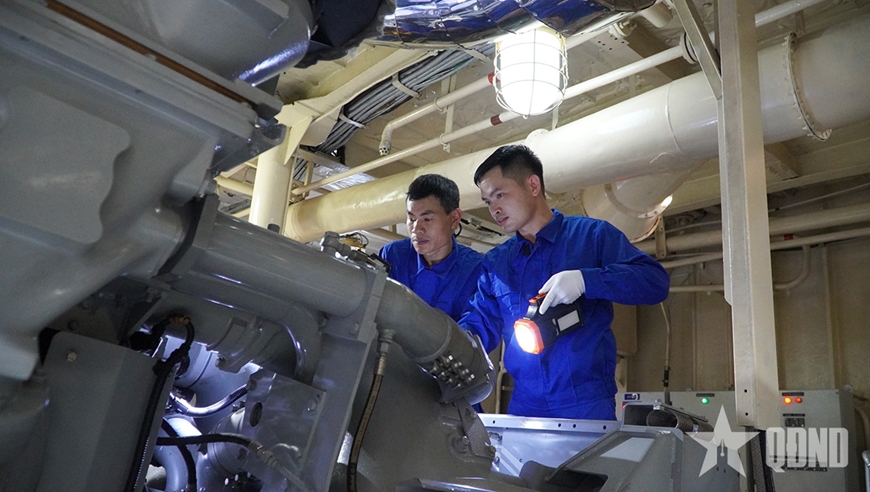 | Đại úy Nguyễn Thanh Tiến, Trưởng ngành 5, Tàu 17 kiểm tra động cơ trong quá trình vận hành. |